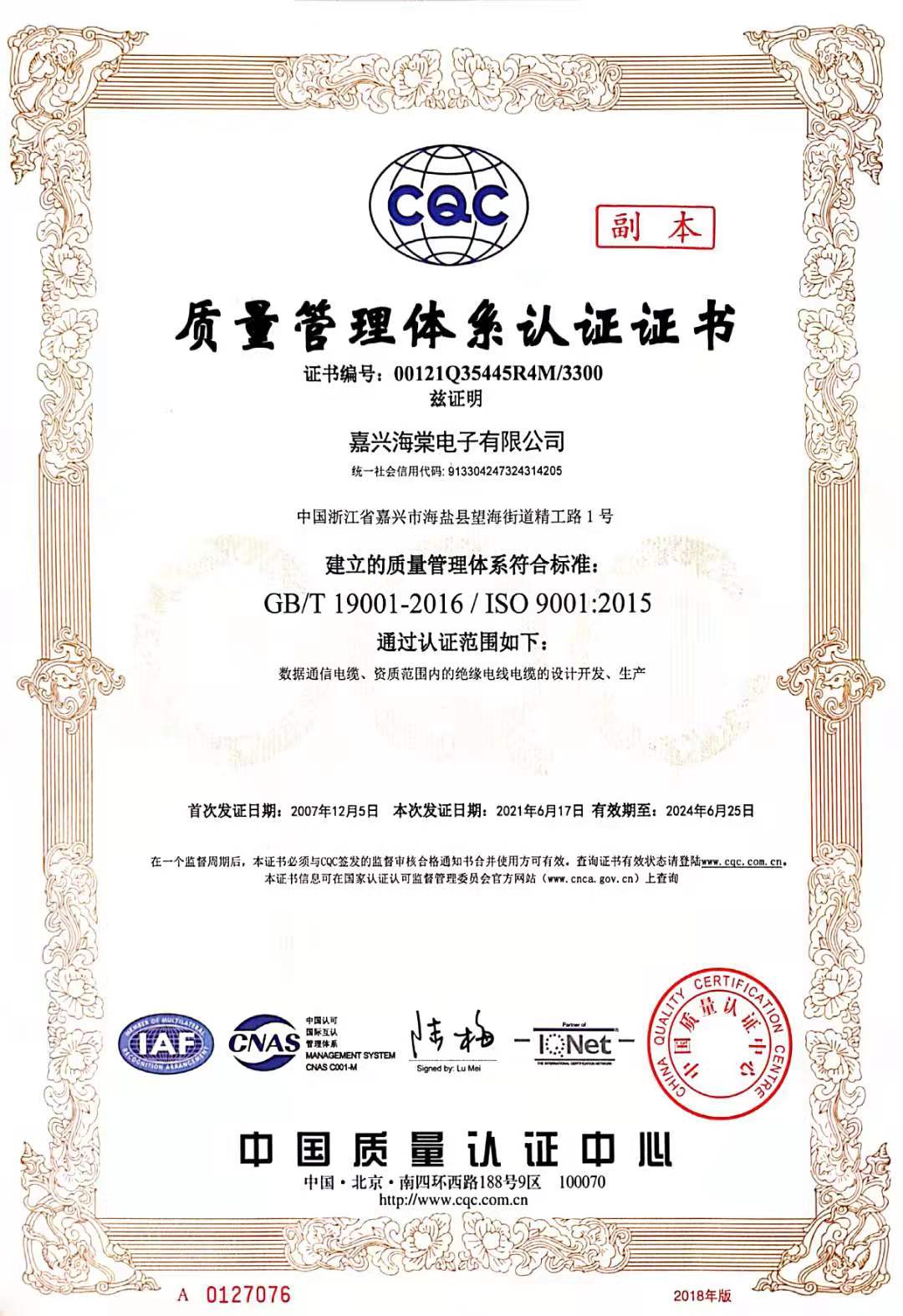 質(zhì)量體系證書(shū)